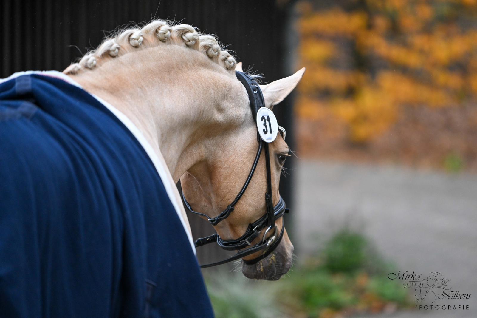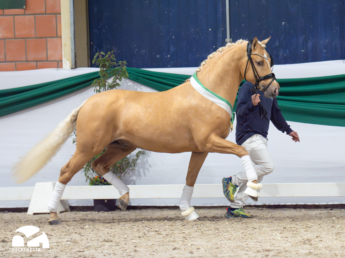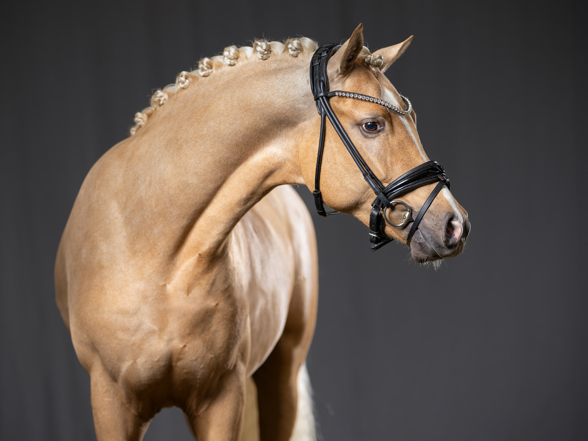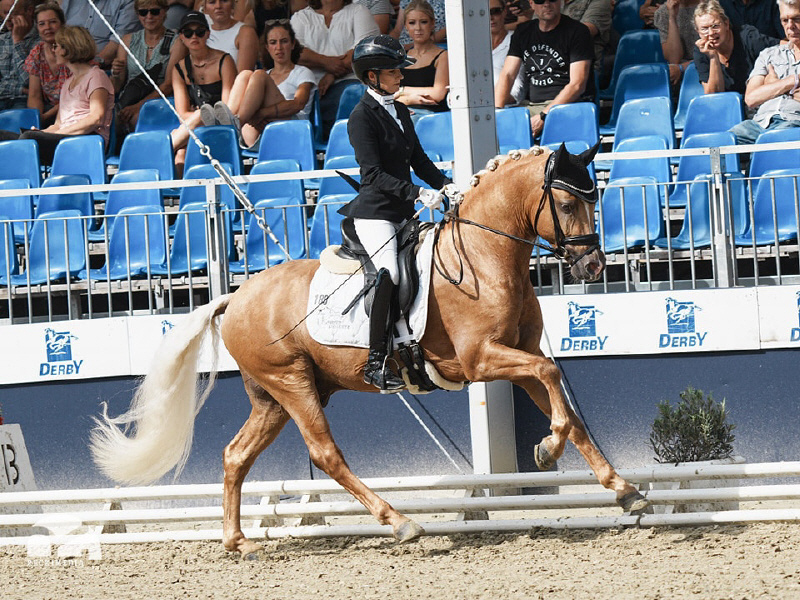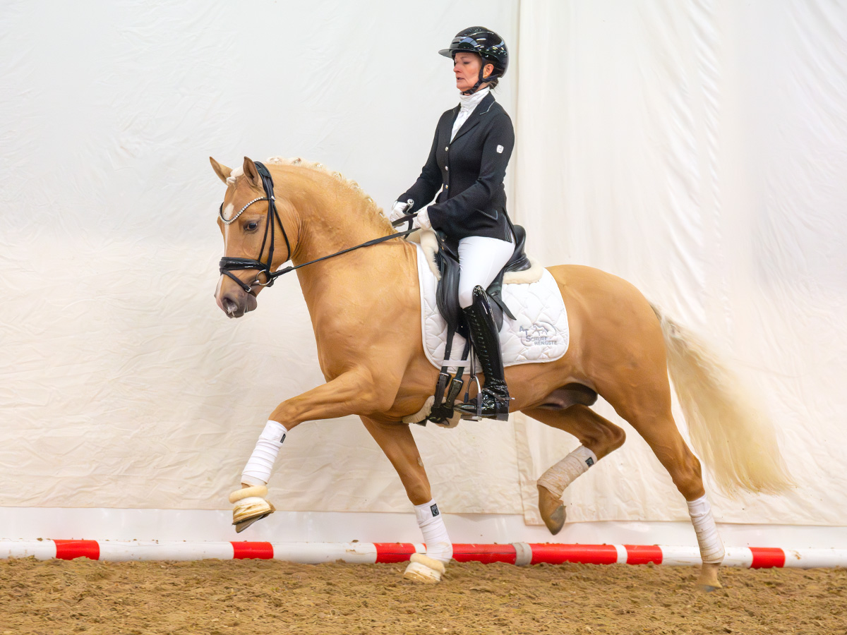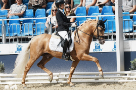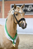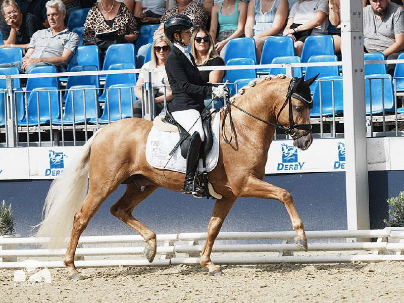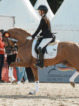 Auch unter dem Reiter bestätigte Der Goldjunge AT NRW seine Qualität eindrucksvoll. Bereits dreijährig gewann er die Sichtungsprüfung zu den Bundeschampionaten mit der Wertnote 8,5. Die Finalqualifikation konnte er mit der herausragenden Wertnote 9,0 für sich entscheiden. Mit der Endnote 8,8 erreichte er im Finale einen ausgezeichneten zweiten Platz und sicherte sich damit den Titel des Vize-Bundeschampions der dreijährigen Reitponyhengste 2024.Im vergangenen Jahr belegte er bei den Bundeschampionaten sowohl in der Einlaufprüfung als auch im Finale jeweils Rang drei und gewann damit die Bronzemedaille der vierjährigen Reitponyhengste.